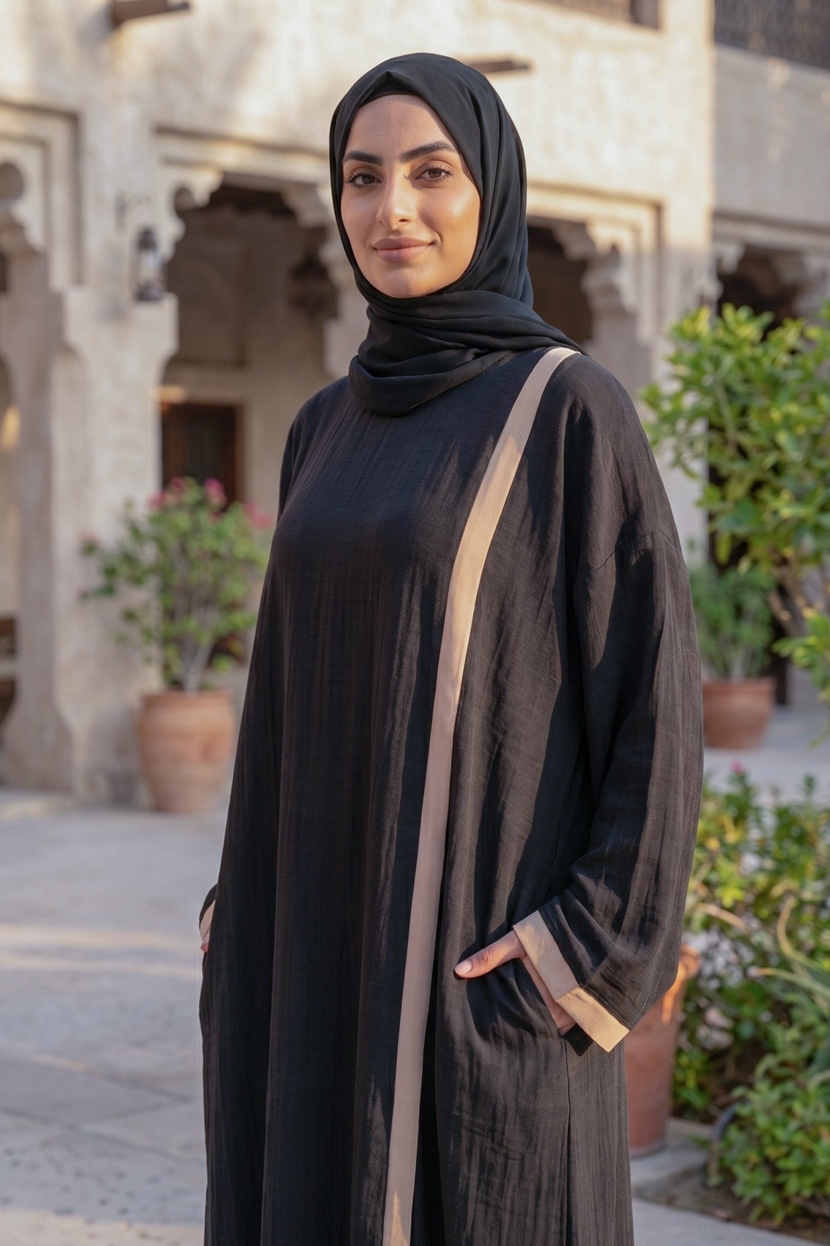 Siyah ve ekru gibi doğaya uyumlu renk seçenekleriyle sunulan Nadra tesettür elbisesi, farklı stil tercihlerine uyum sağlayacak şekilde tasarlanmıştır. Siyah renk seçeneği daha güçlü, zamansız ve bütünleşik bir görünüm sunarken; ekru renk seçeneği daha ferah, sakin ve saf bir etki oluşturur. Her iki seçenek de müslin kumaşın kendine has zarif dokusunu dengeli biçimde öne çıkarır ve modelin sade tasarım çizgisini korur.